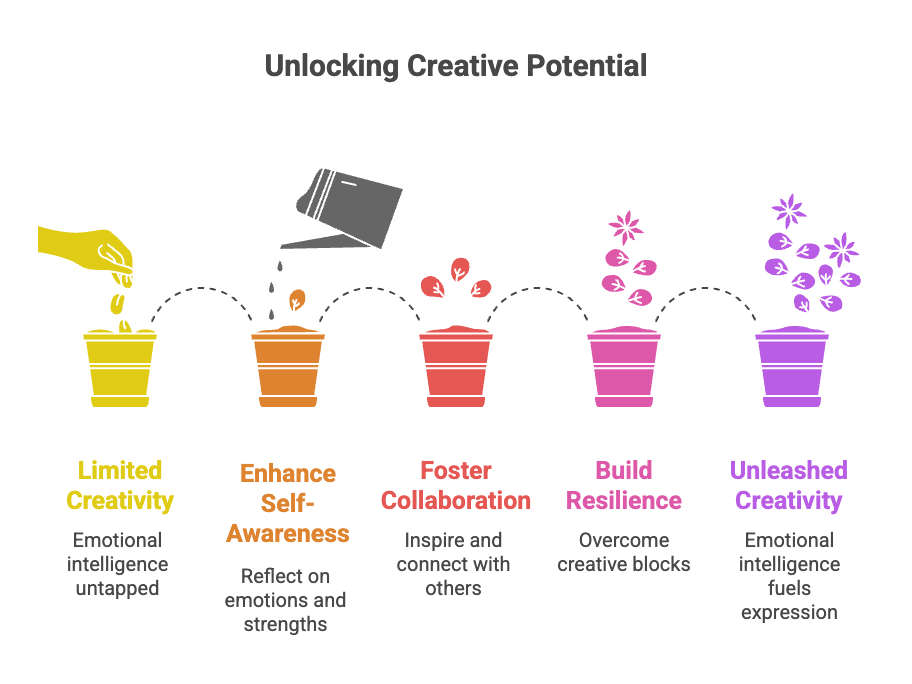 Emotional intelligence fosters artistic growth and innovation by enhancing self-awareness, fostering more profound empathy, cultivating curiosity, building resilience, and inspiring collaboration.