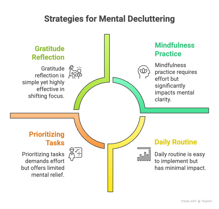 Additionally, practicing gratitude can be a powerful tool in decluttering your mind. Take a few moments each day to reflect on what you are grateful for. This simple practice helps shift your focus from what may be causing mental clutter to the positive aspects of your life. It allows you to appreciate the present moment and cultivate a more positive mindset, freeing your mind from unnecessary worry and stress.