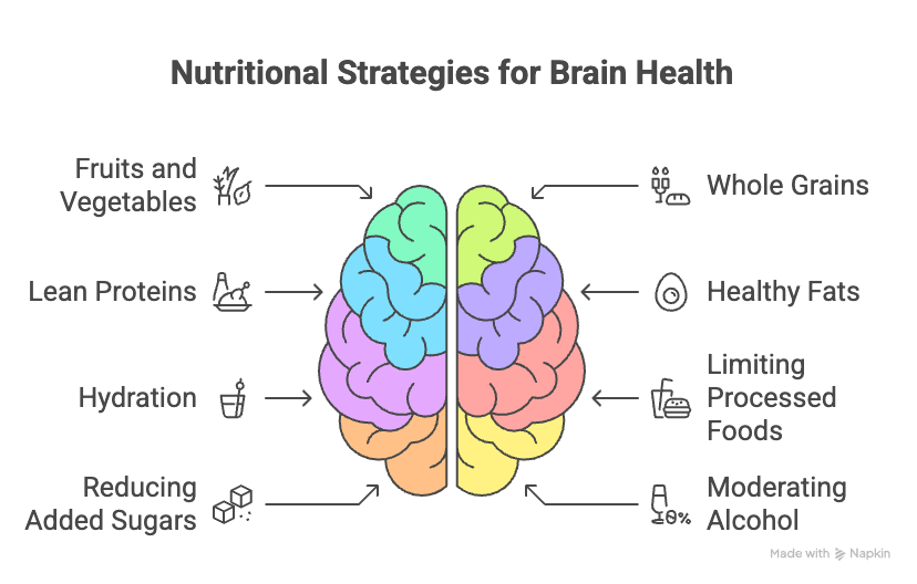 Prioritizing a diet rich in fruits, vegetables, whole grains, lean proteins, and healthy fats can provide essential nutrients, such as antioxidants, omega-3 fatty acids, and vitamins B and E, which are beneficial for brain health.