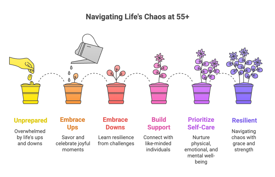 Life at 55+ is a beautifully chaotic journey, filled with triumphs, challenges, and everything in between. By embracing the ups and downs, finding resilience amidst the chaos, and prioritizing self-care, we can navigate it gracefully and unlock the wisdom that awaits us.