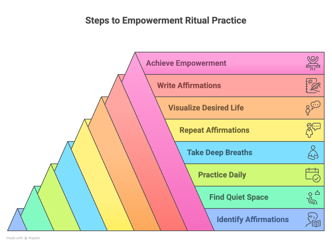 To create an empowerment ritual practice, it's critical to start by identifying specific affirmations that resonate with one's deepest desires.