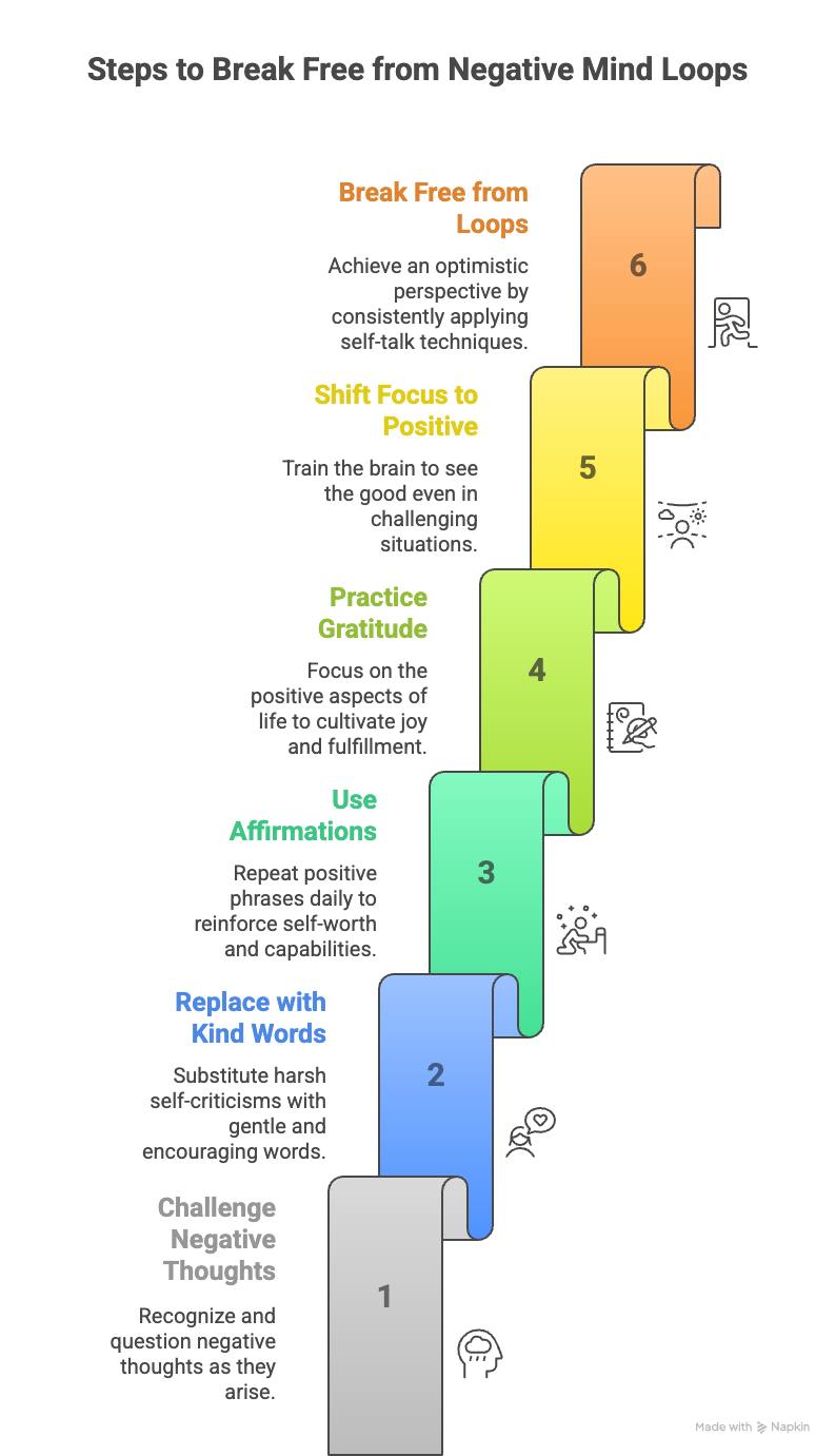 Practicing these self-talk techniques consistently can help you break free from negative mind loops and create a more optimistic perspective.